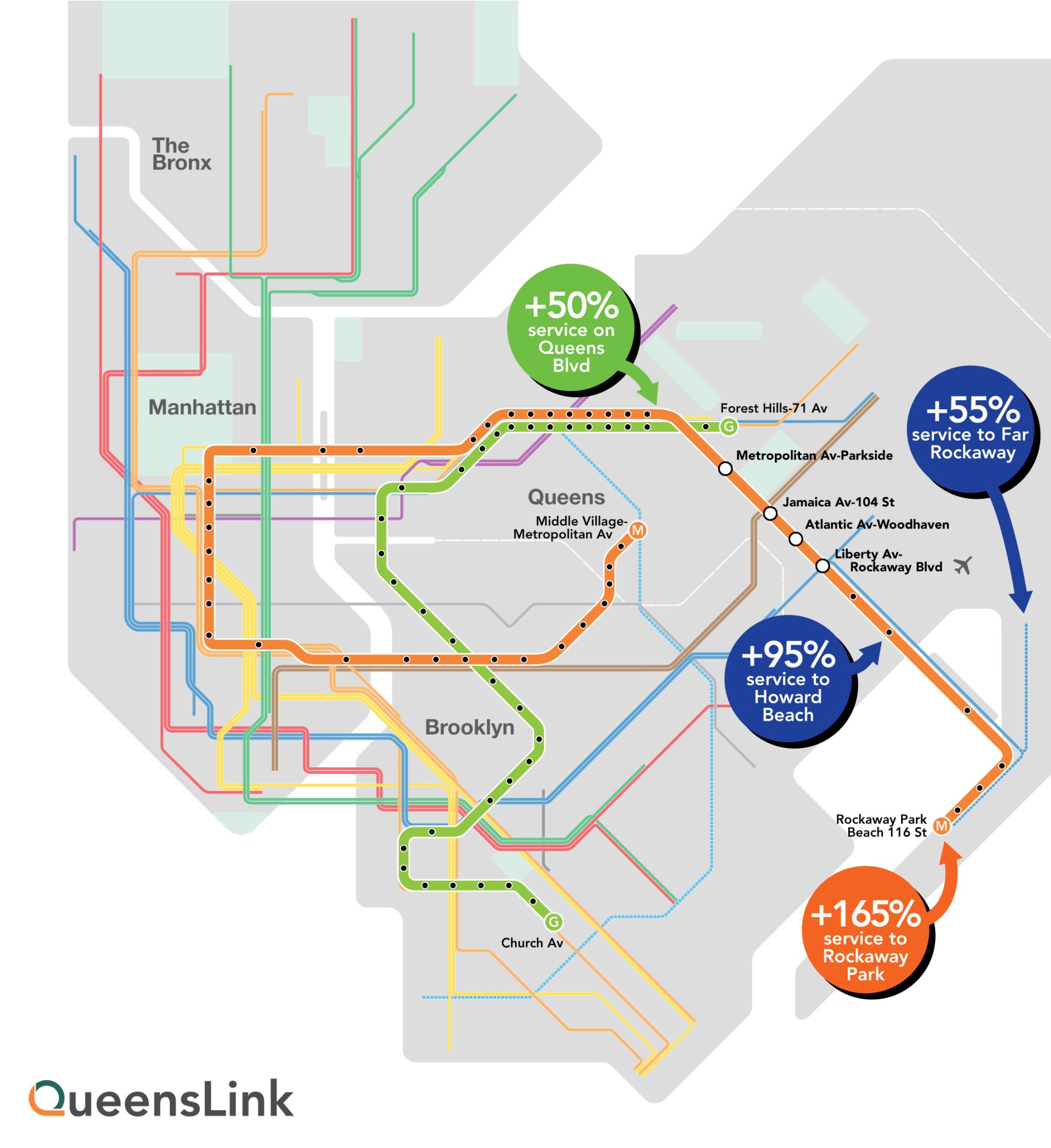 Residents of Queens will see travel times across the borough slashed by up to 60%. Riders of the Queens Blvd subway line will see a 50% increase in service, while riders on the Rockaway Line will see service increased up to 165%.